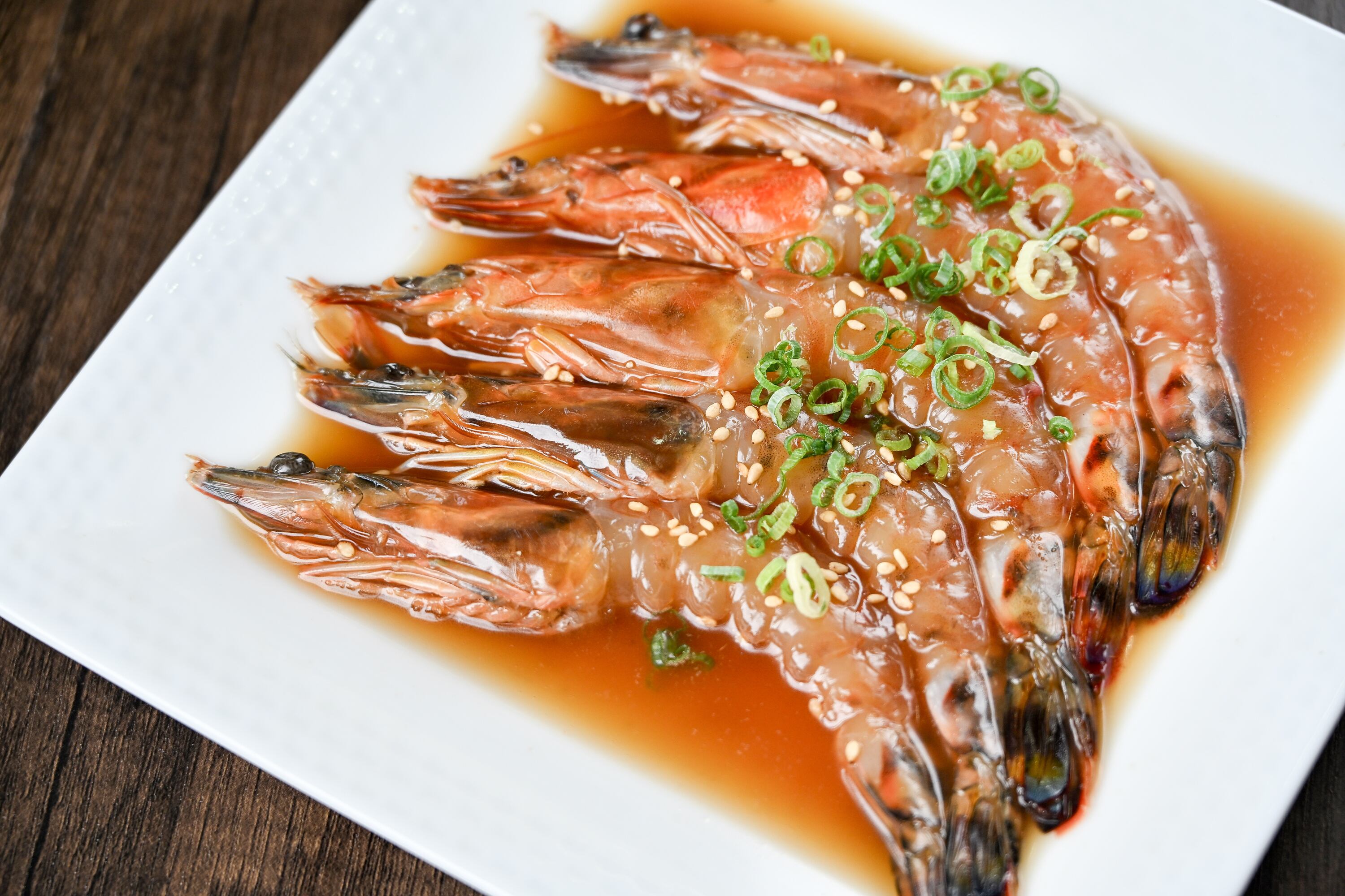 ぷりっぷりの食感がたまらない「車海老カンジャンセウ」! 高級食材として知られる愛知県産の天然車海老を使用し、南知多で収穫された野菜を使用した特製の醤油ダレにじっくりと漬け込んだ逸品です。